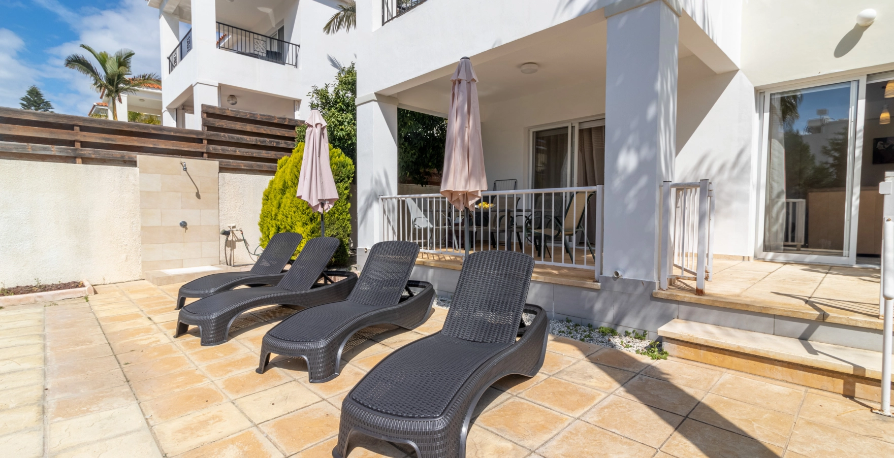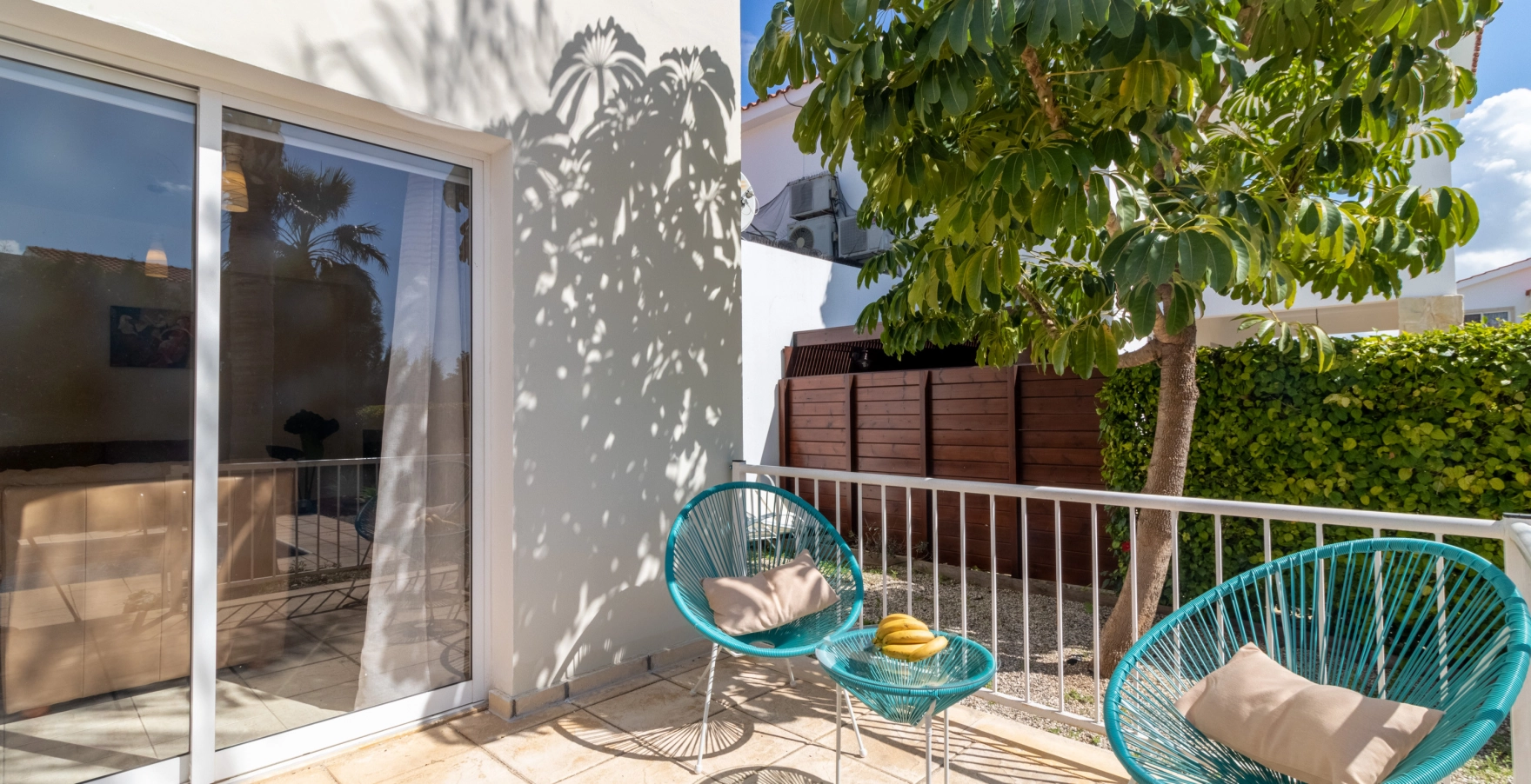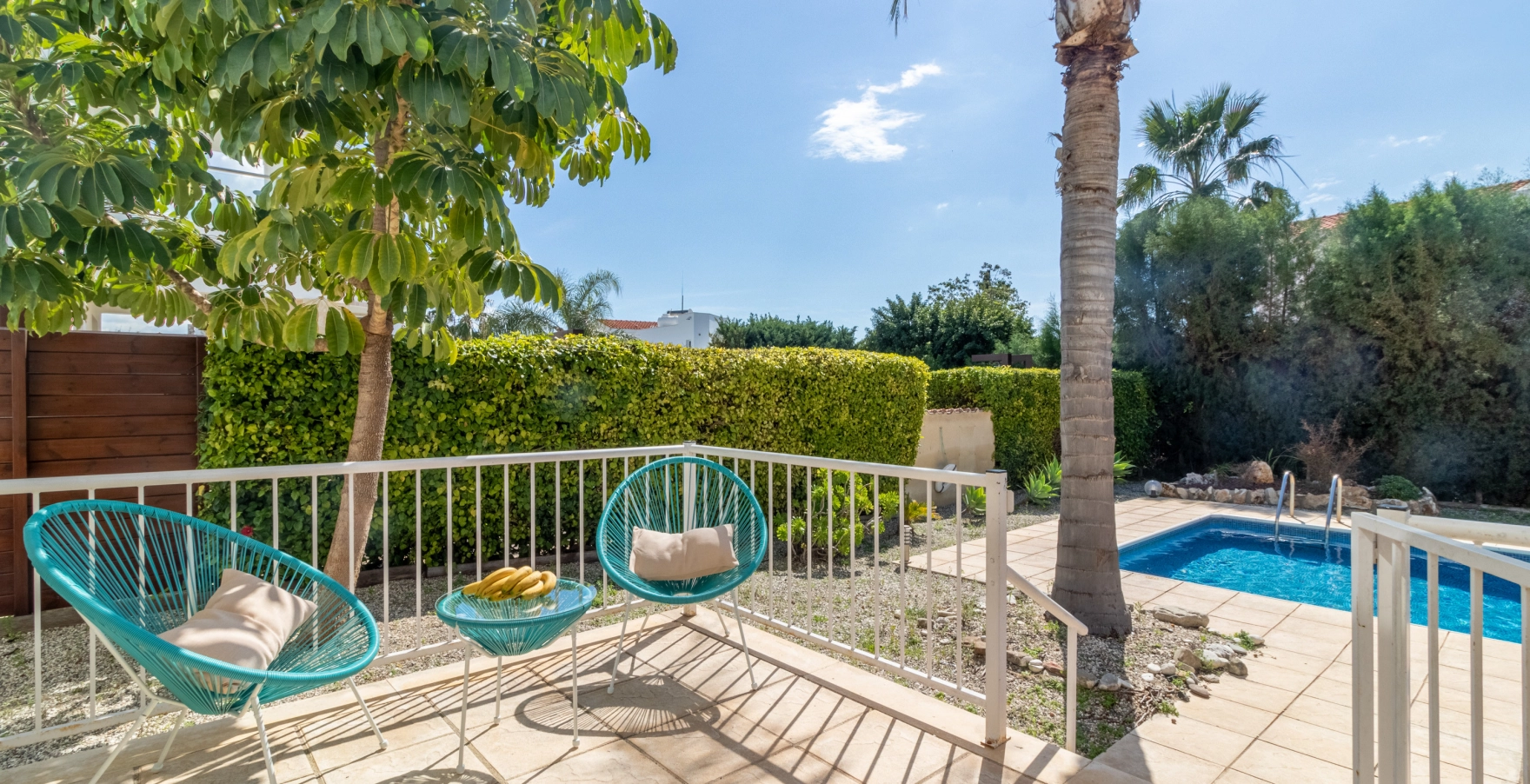 Escape to Villa Matheos, where relaxation awaits. This inviting retreat features three cozy bedrooms, a lounge adorned with plush leather sofas, a stylish dining area, and a fully equipped kitchen. Step onto the spacious patio and immerse yourself in comfort, surrounded by the beauty of white orchids and lush green ficus plants.
