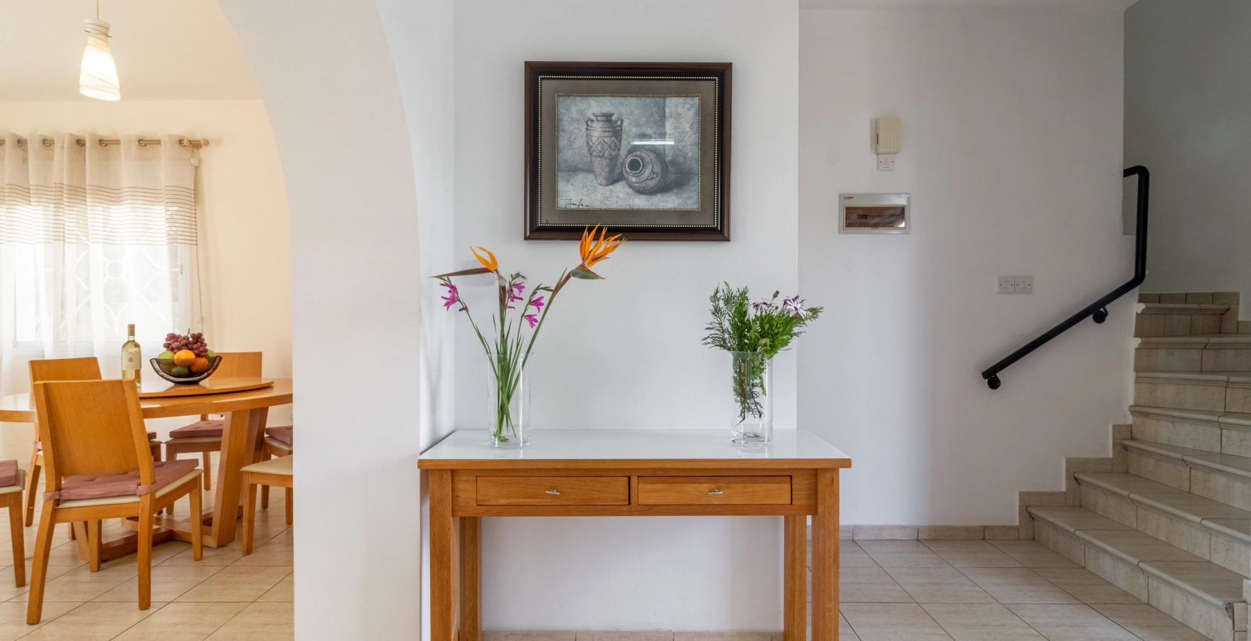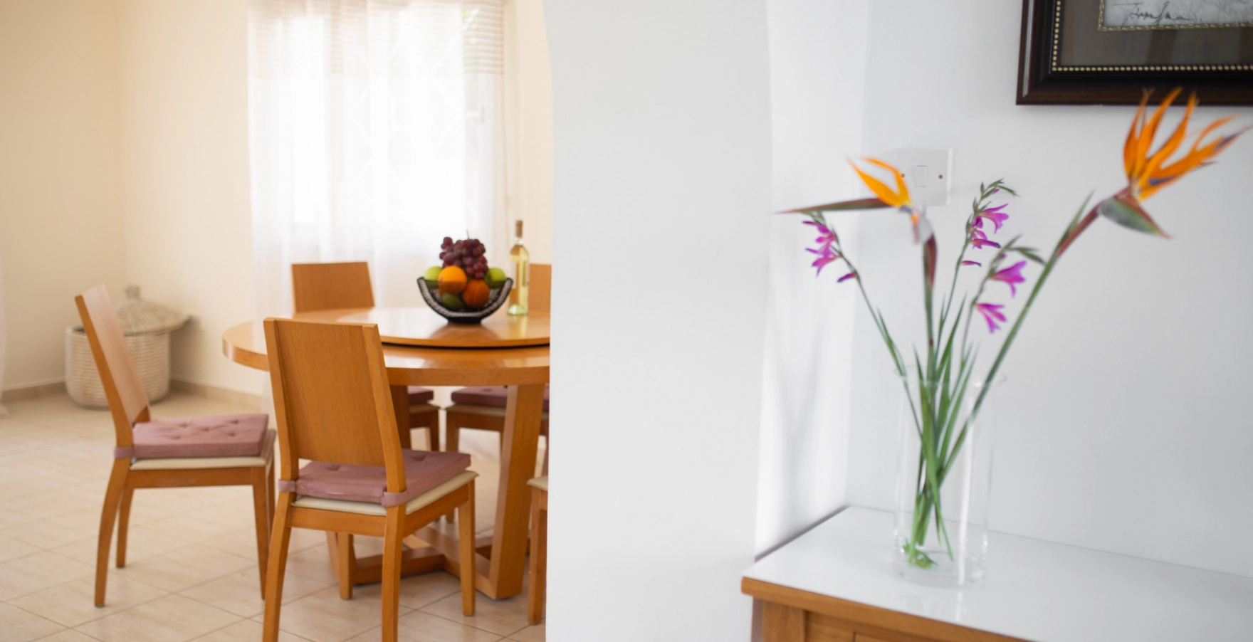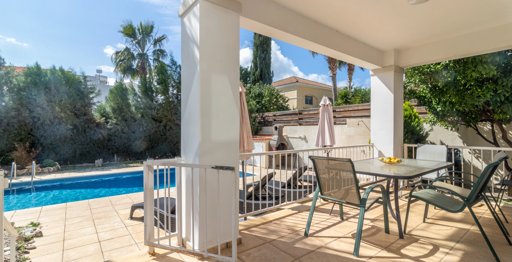 Escape to Villa Matheos, where relaxation awaits. This inviting retreat features three cozy bedrooms, a lounge adorned with plush leather sofas, a stylish dining area, and a fully equipped kitchen. Step onto the spacious patio and immerse yourself in comfort, surrounded by the beauty of white orchids and lush green ficus plants.