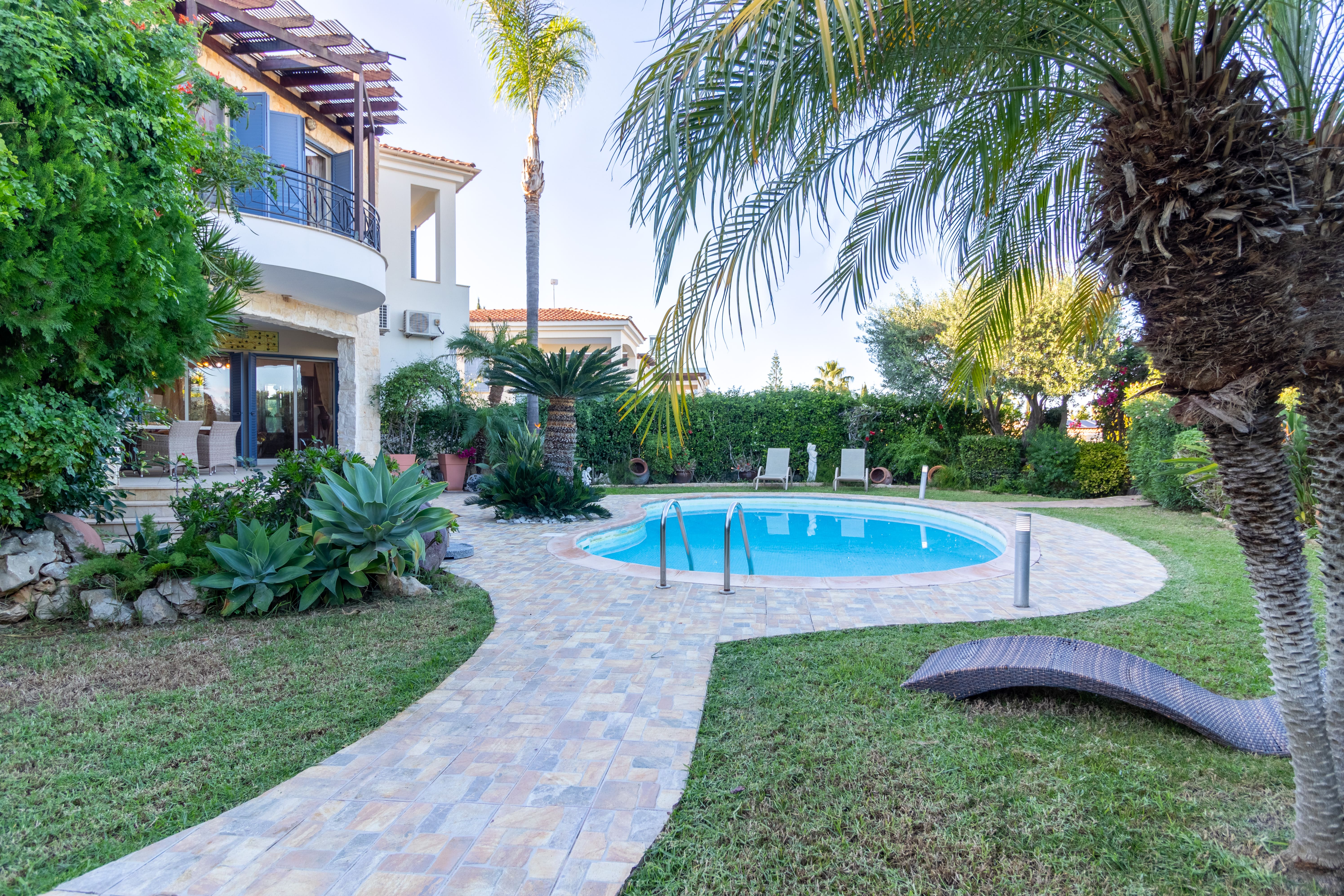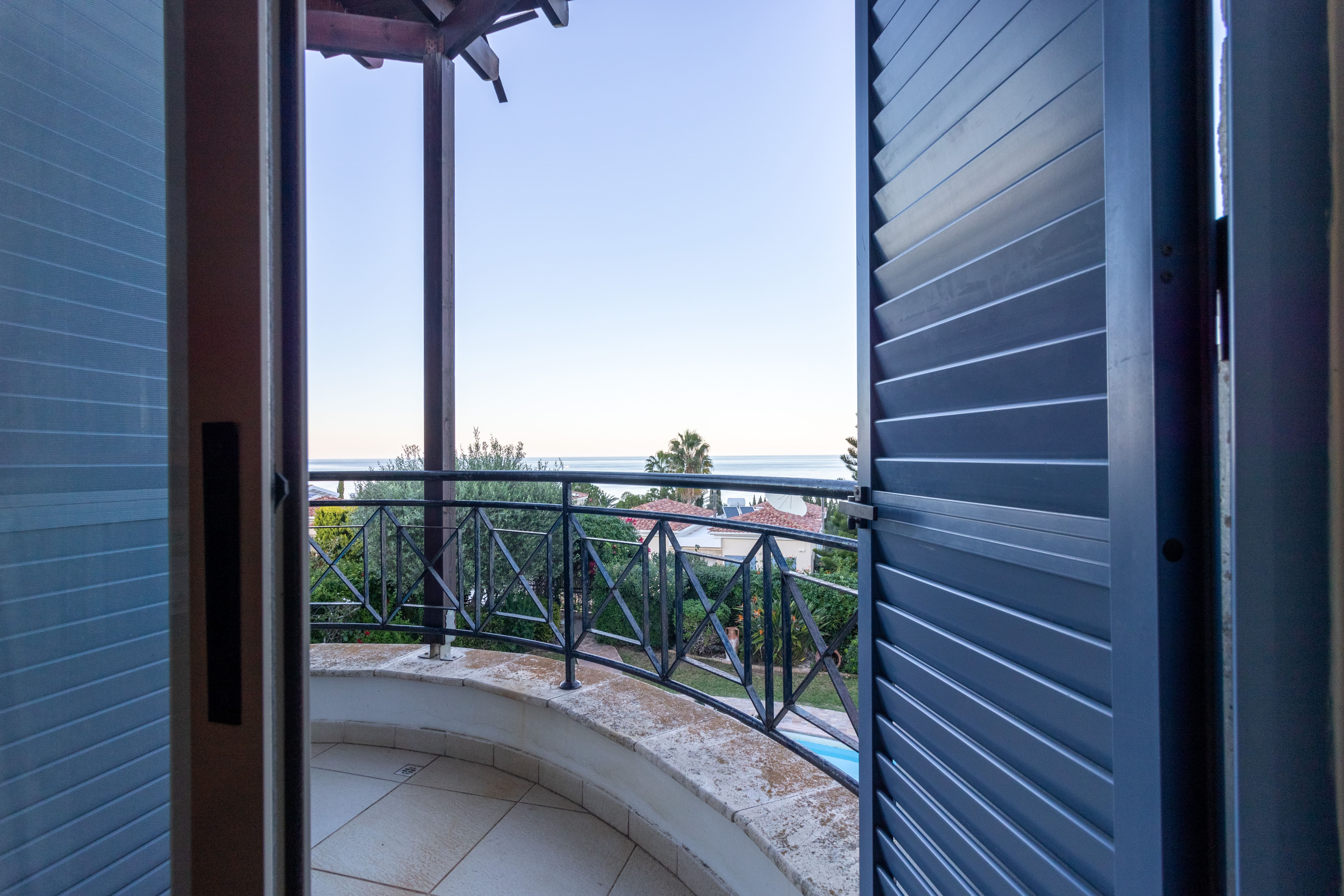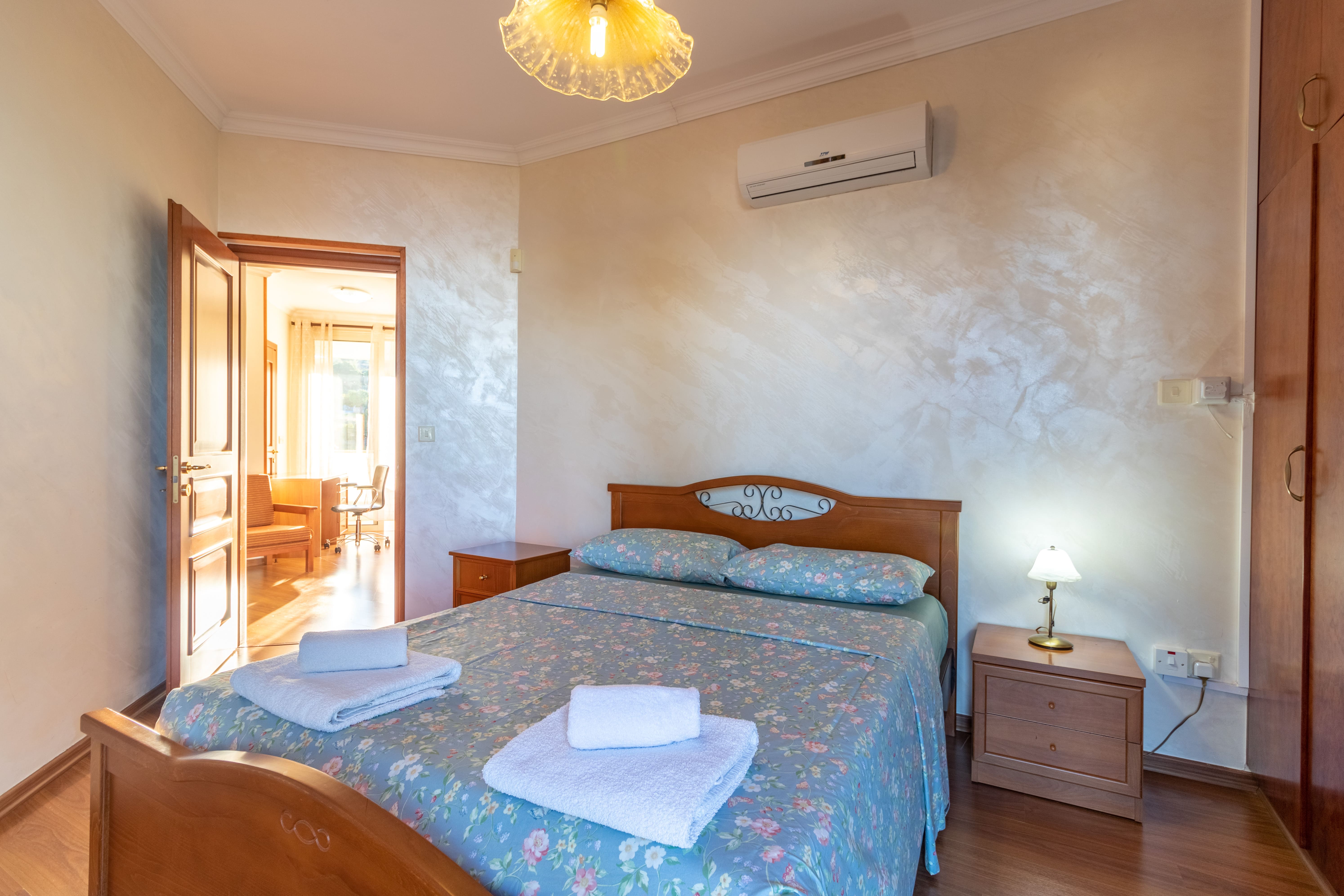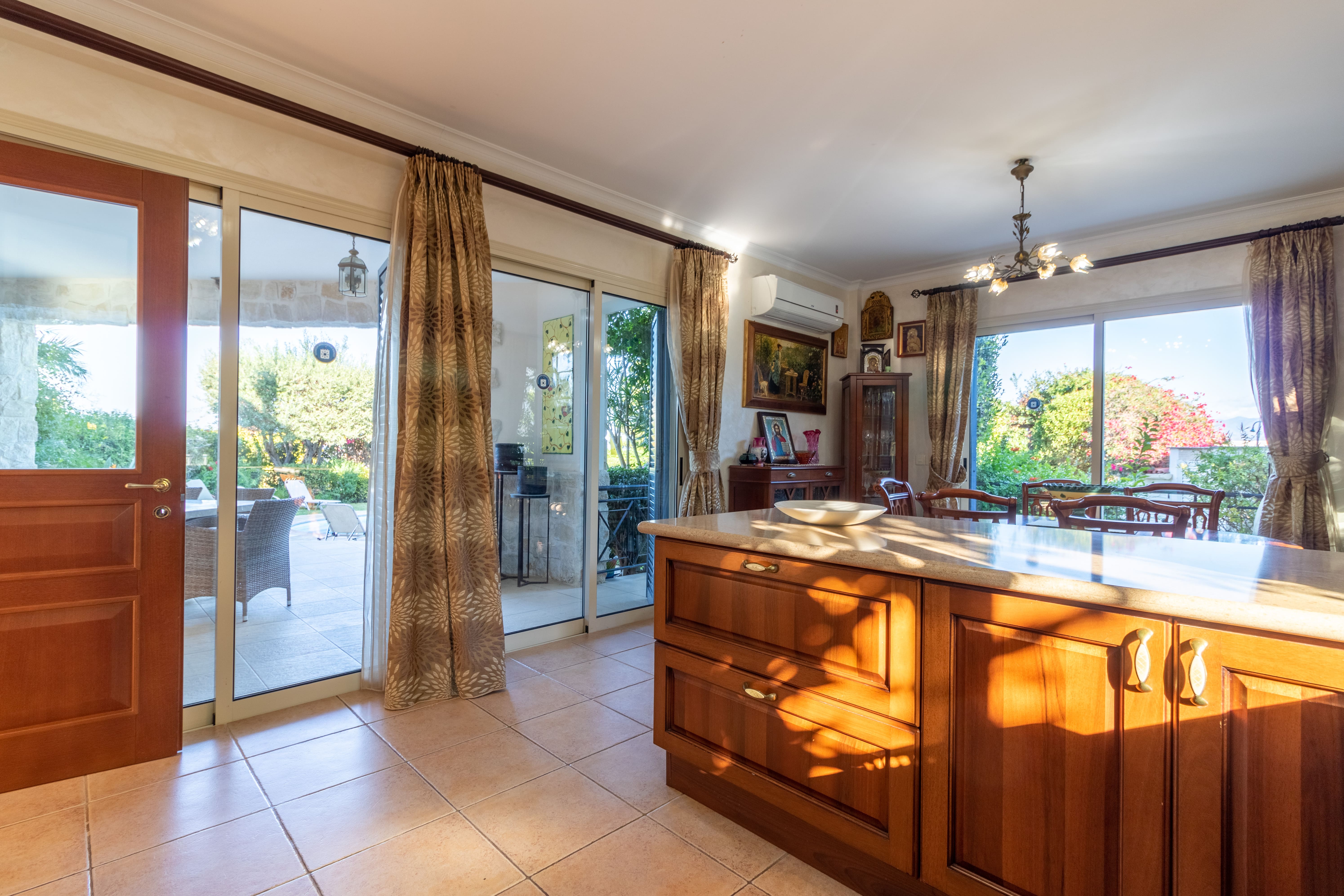 4 bedrooms, 5 bathrooms, a living room with a kitchen, a hall, a billiard room and a green well-groomed garden with a pool heated in winter. The beach and the nearest fish tavern are 3 minutes walk. A 3-minute drive away is the baths of Aphrodite, where tourists come to admire the eucalyptus branches hanging to the ground and the clear water of the goddess’ spring.