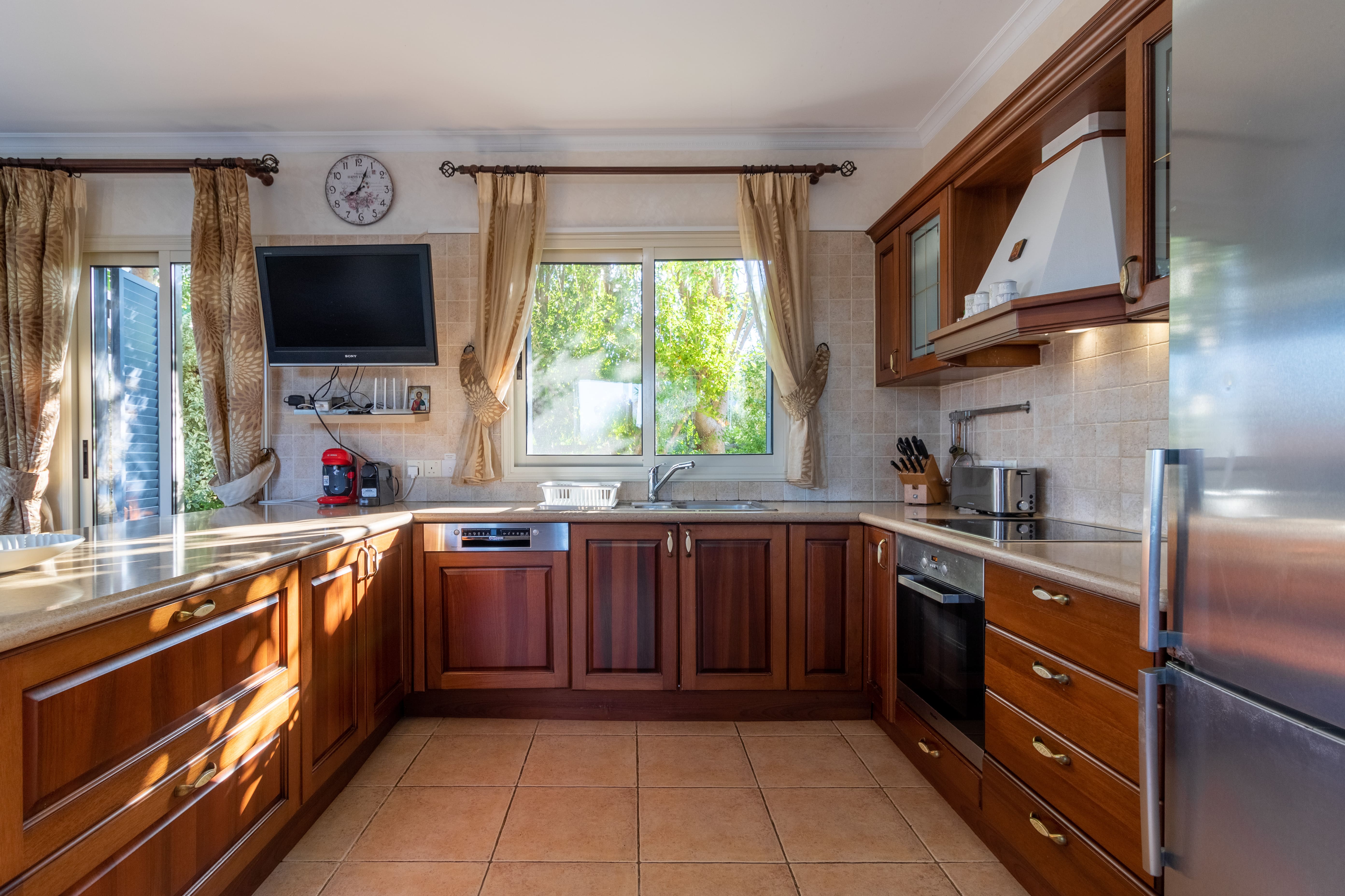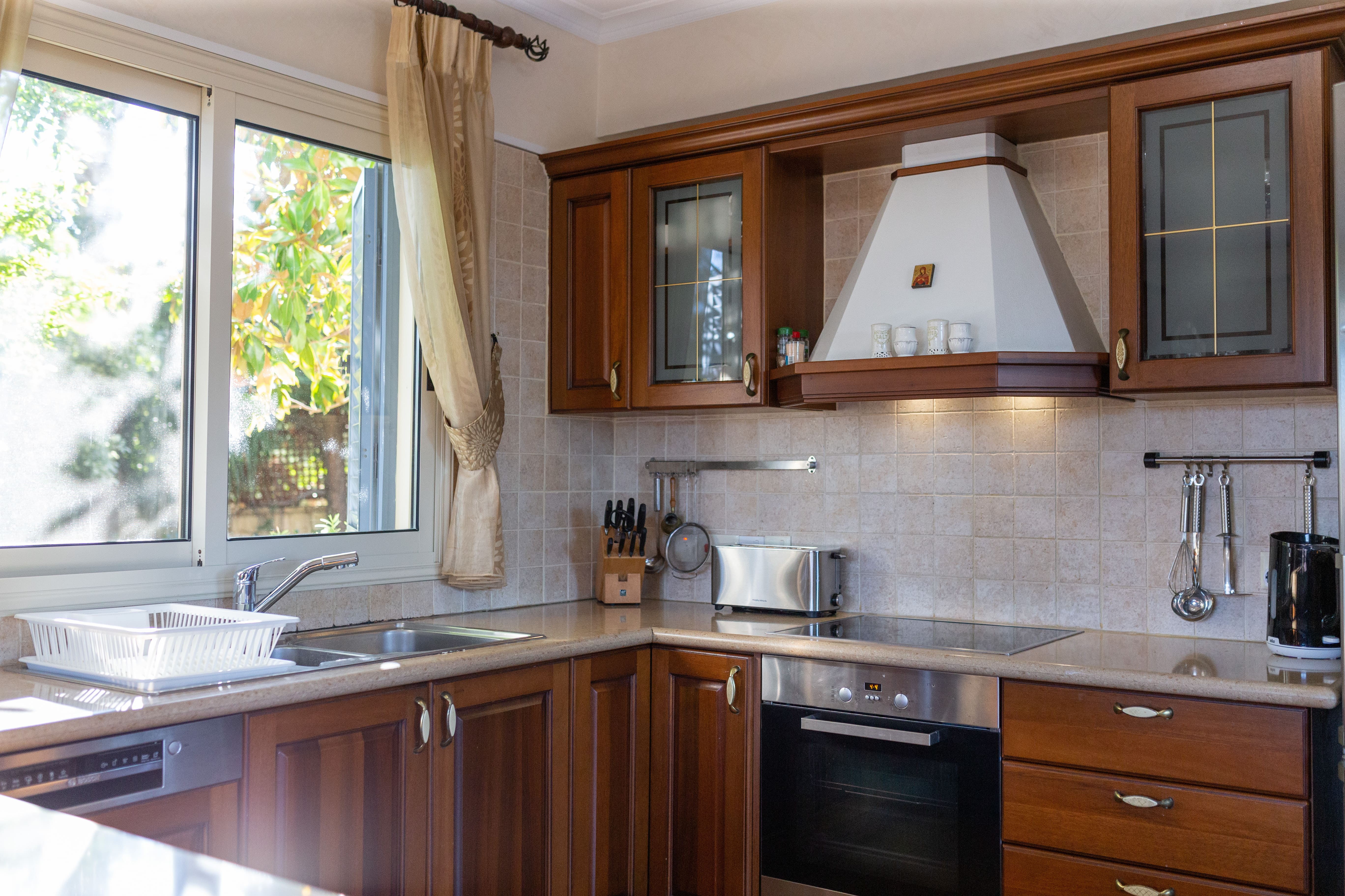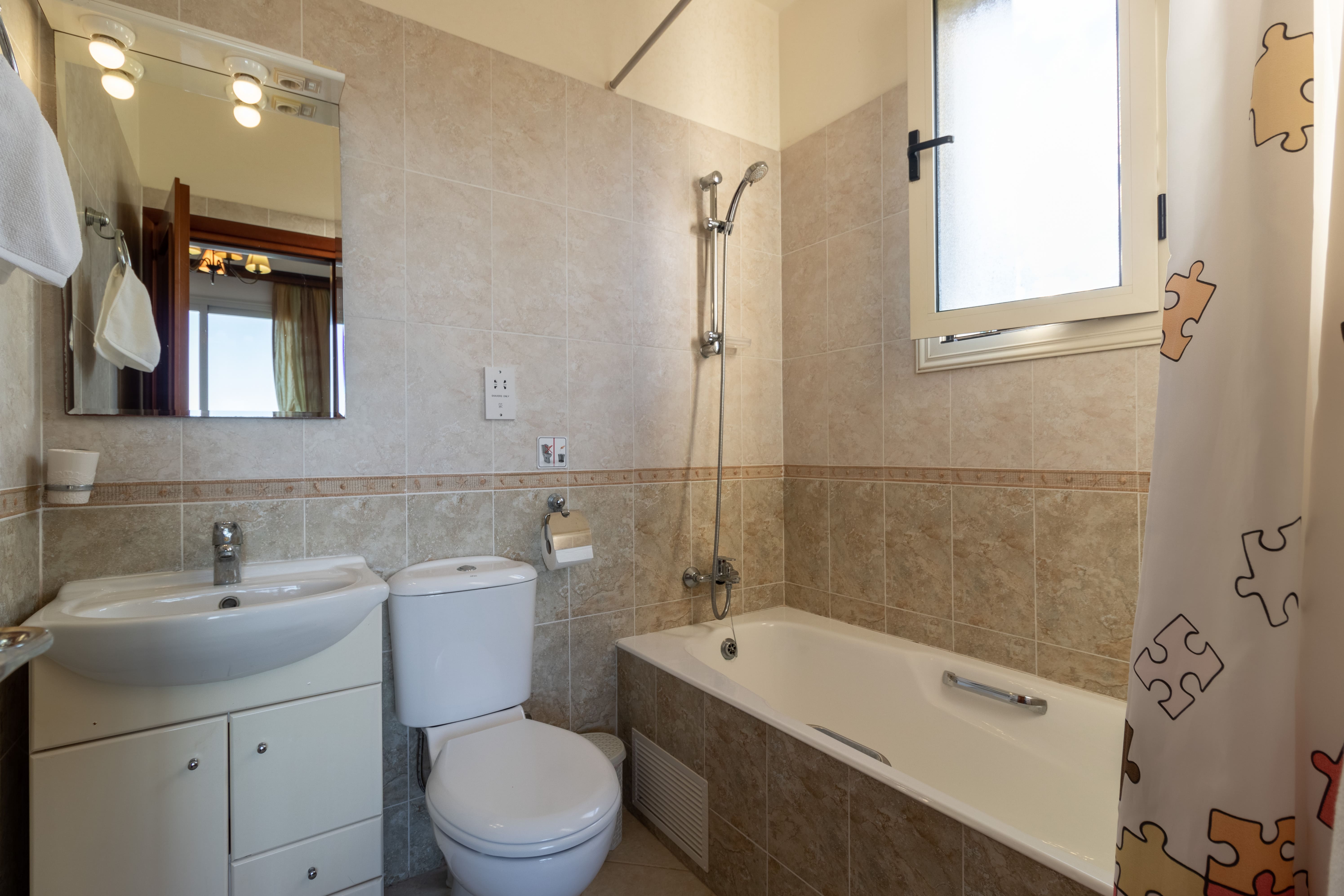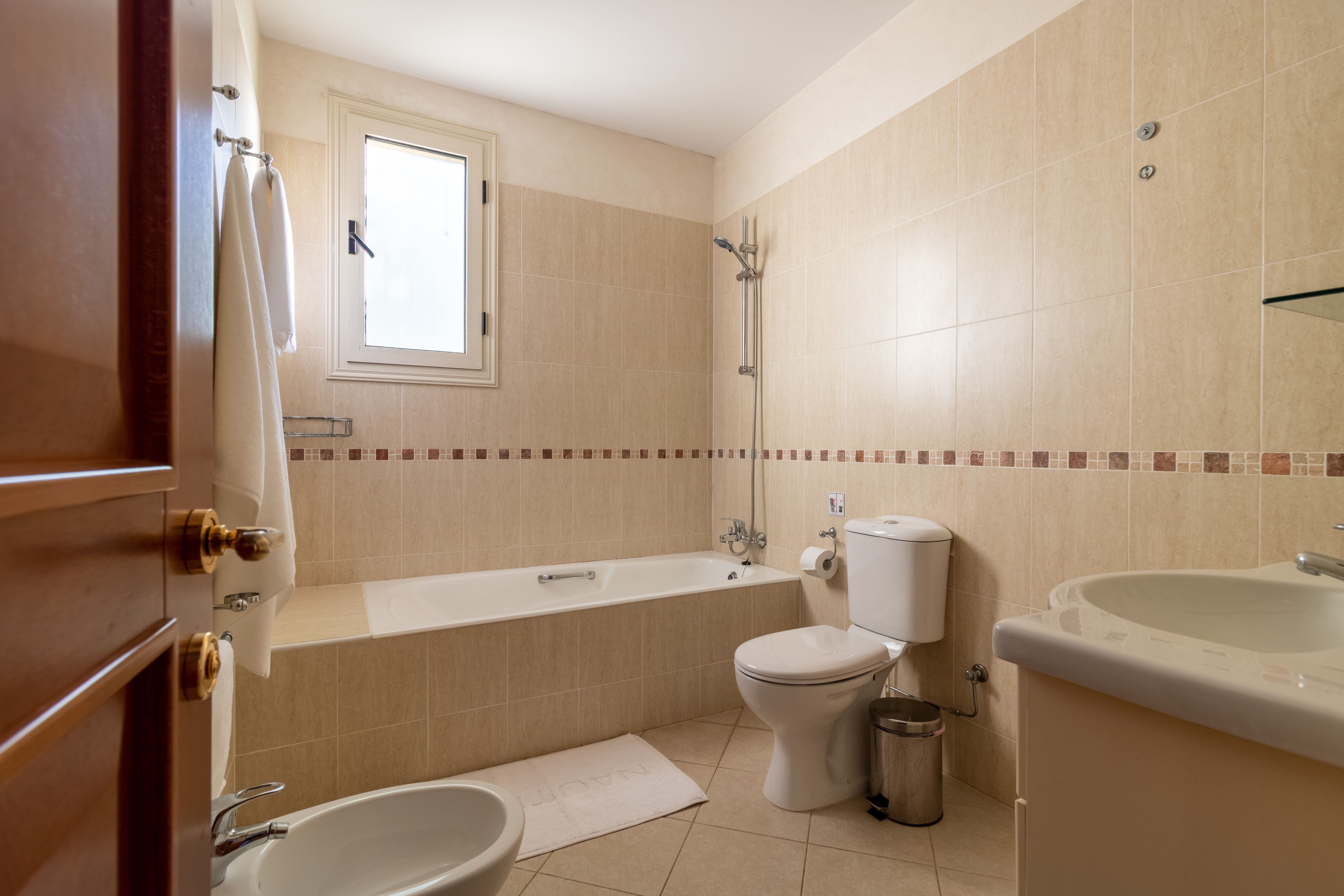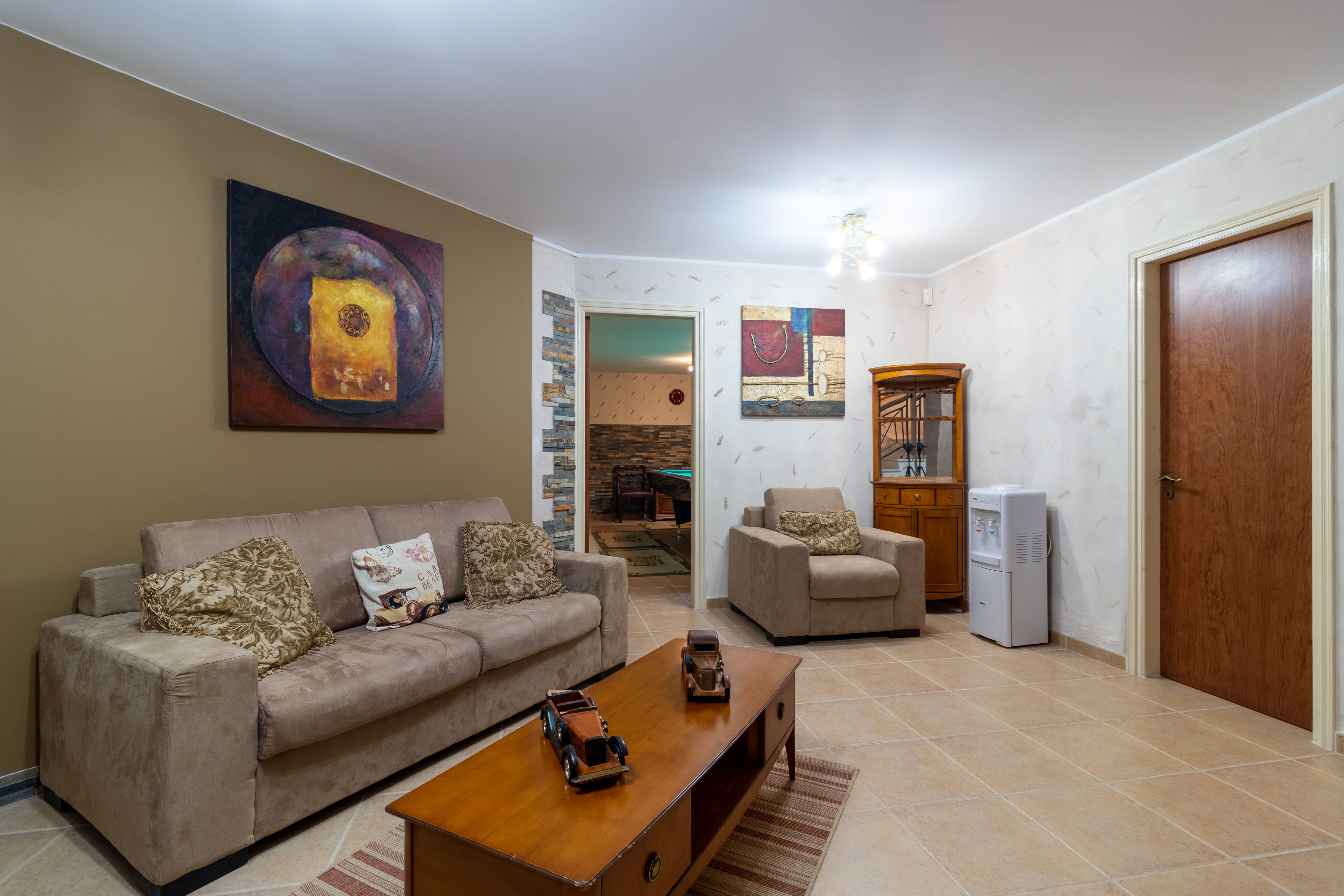 4 bedrooms, 5 bathrooms, a living room with a kitchen, a hall, a billiard room and a green well-groomed garden with a pool heated in winter. The beach and the nearest fish tavern are 3 minutes walk. A 3-minute drive away is the baths of Aphrodite, where tourists come to admire the eucalyptus branches hanging to the ground and the clear water of the goddess’ spring.
