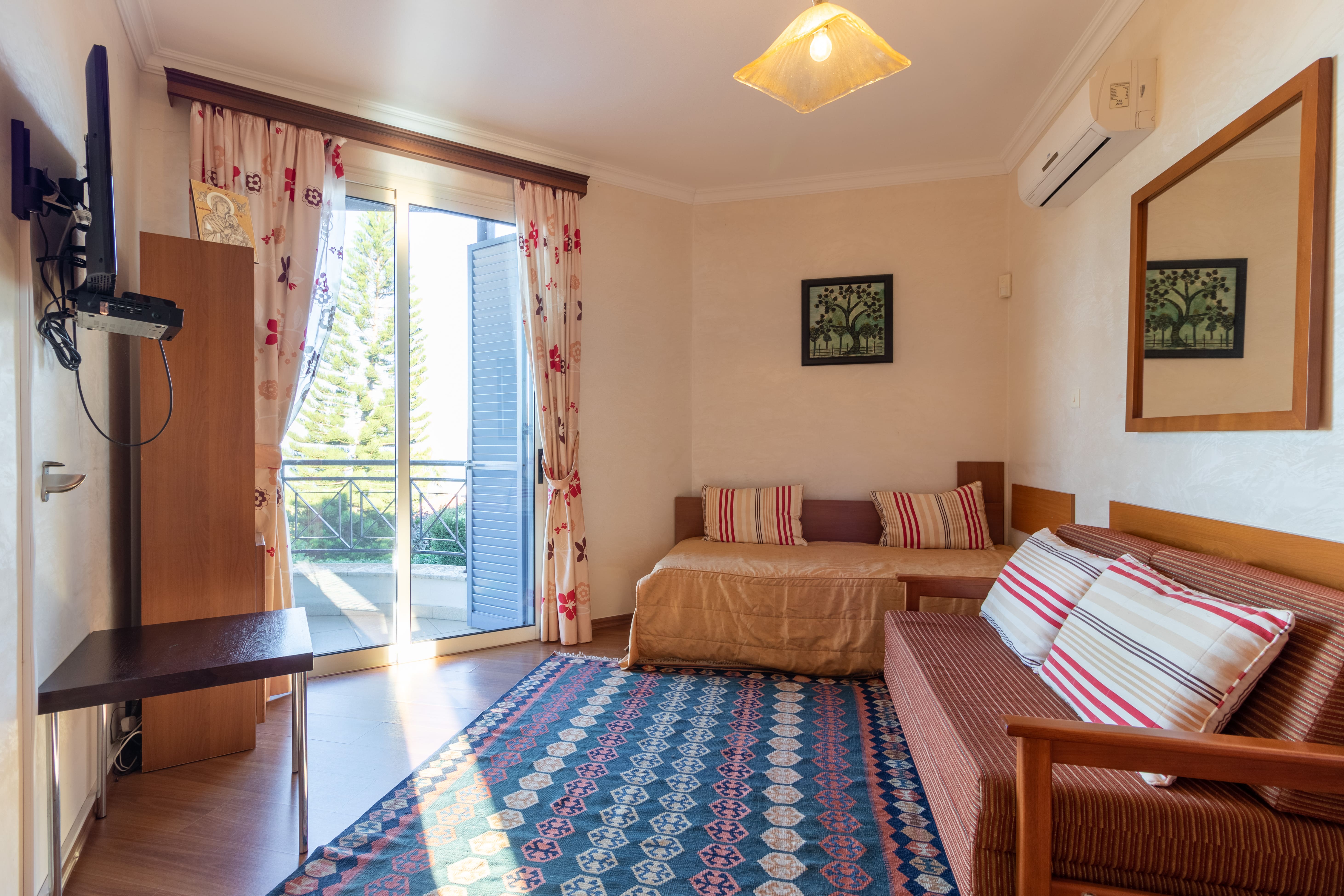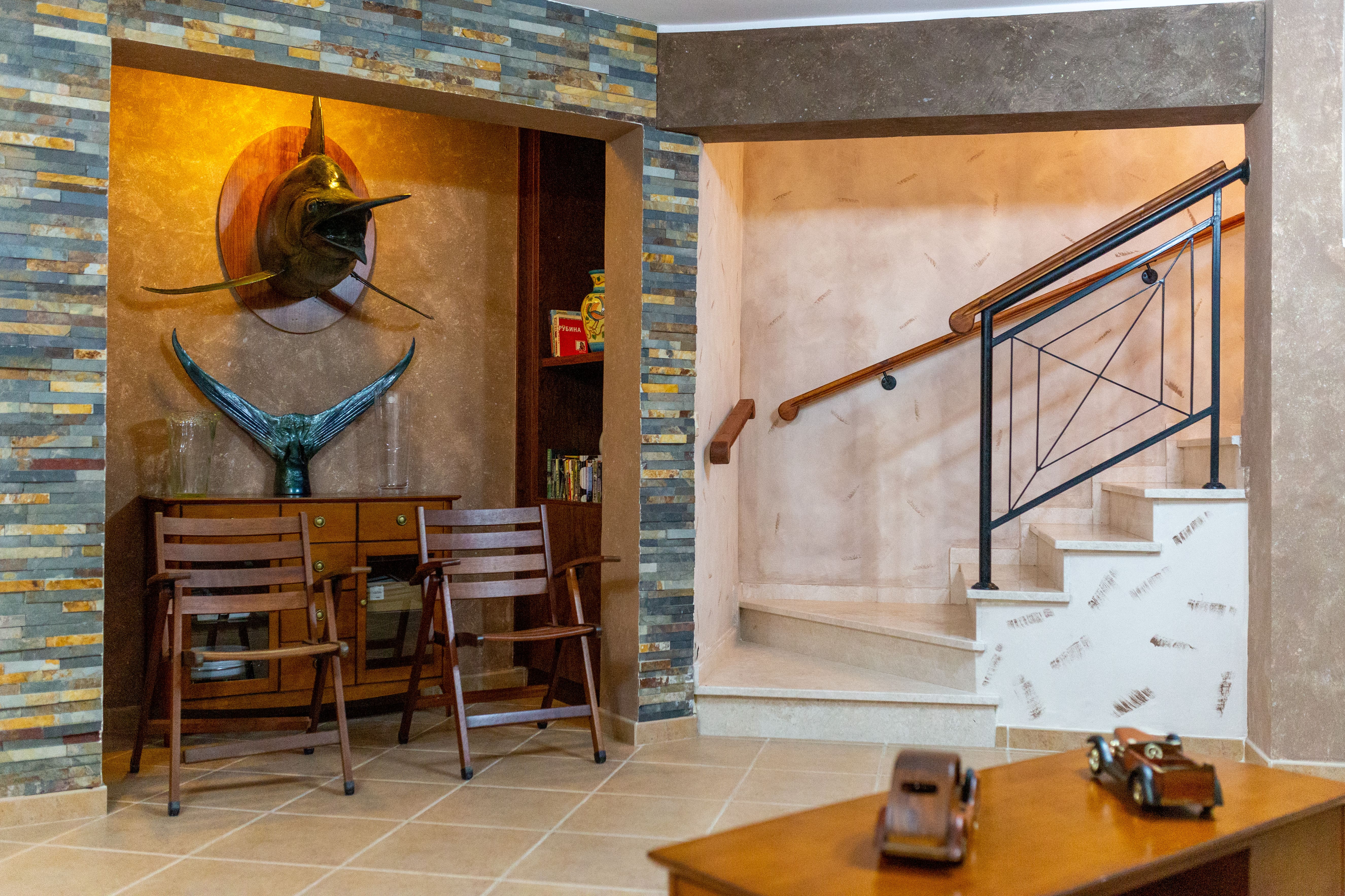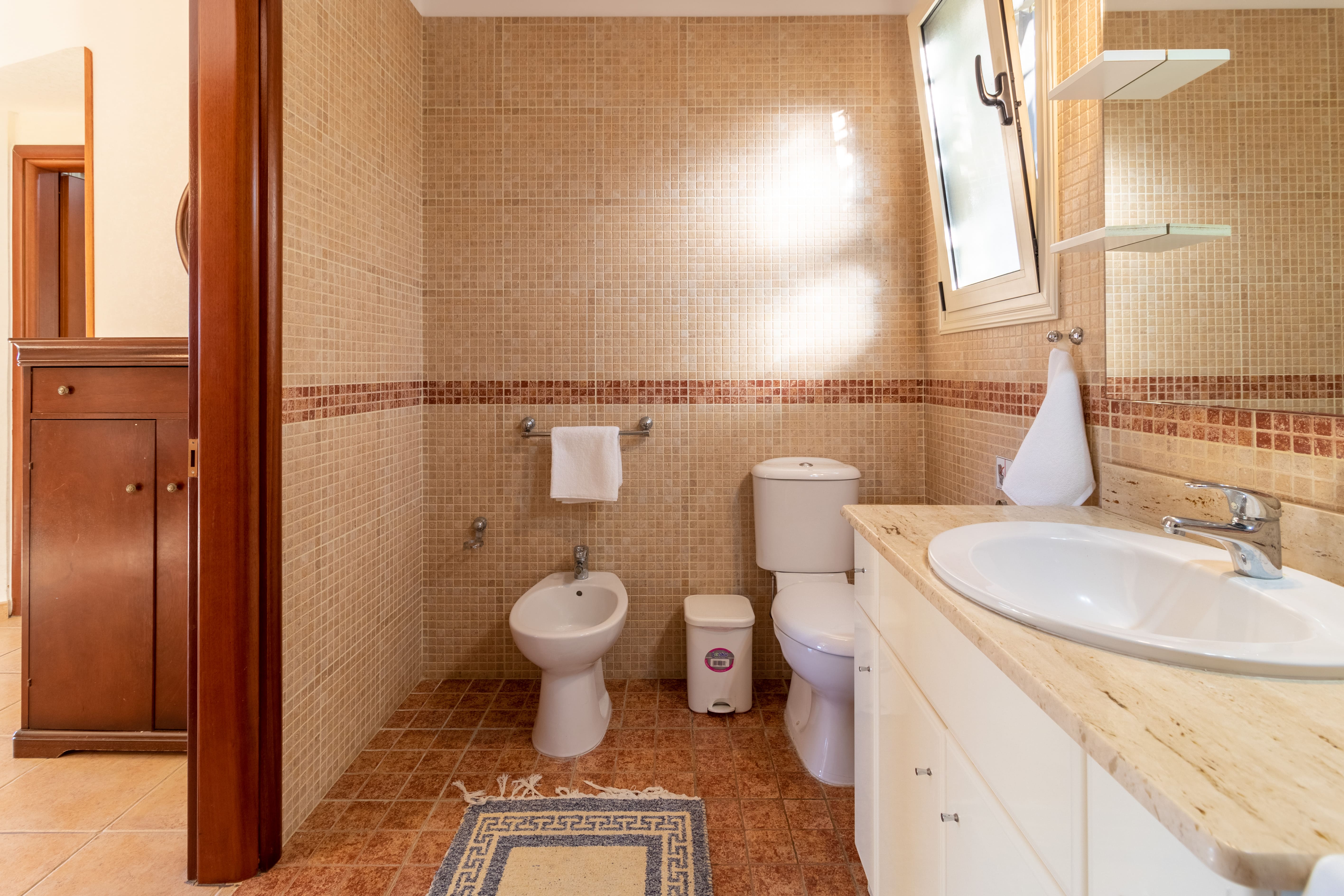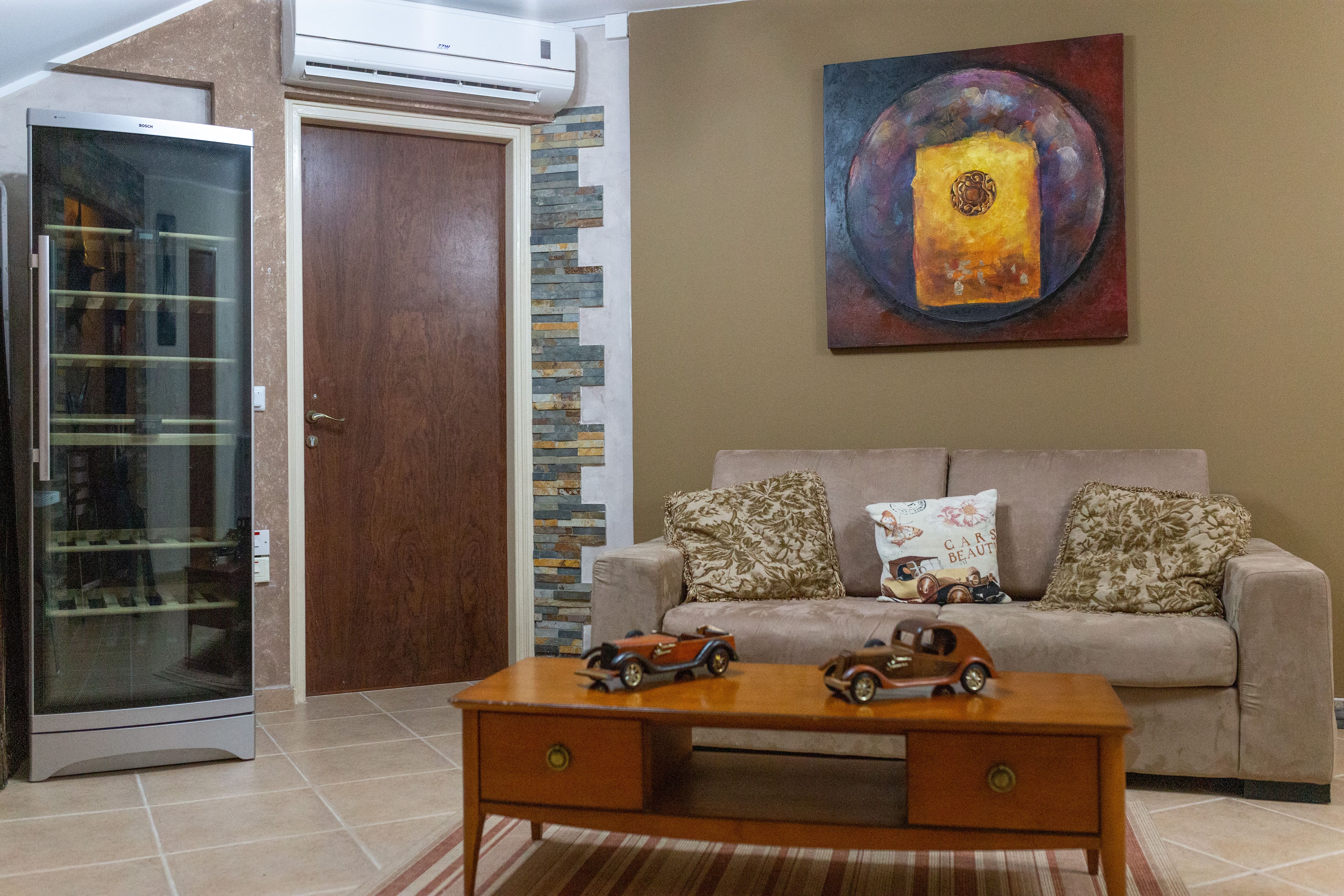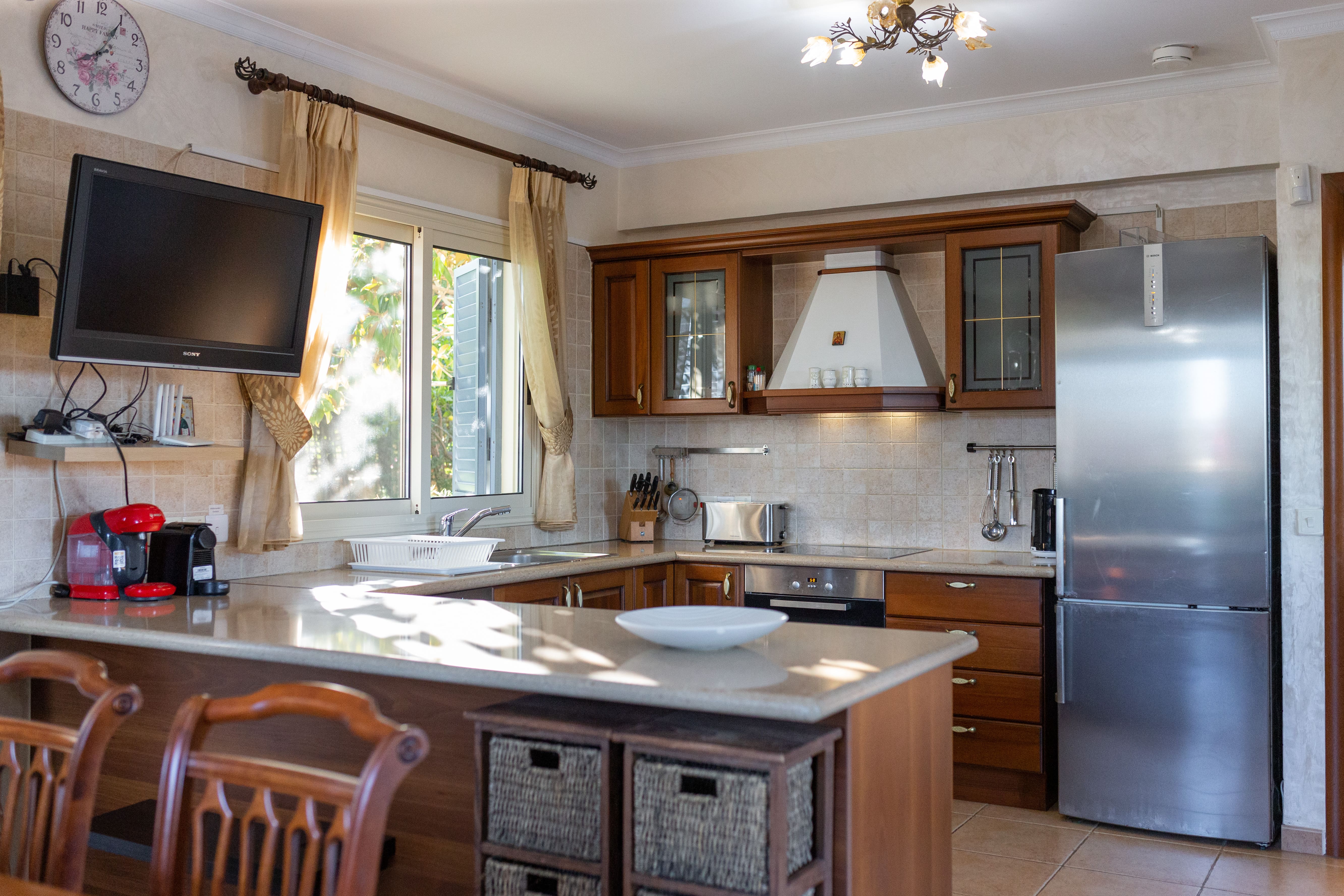 4 bedrooms, 5 bathrooms, a living room with a kitchen, a hall, a billiard room and a green well-groomed garden with a pool heated in winter. The beach and the nearest fish tavern are 3 minutes walk. A 3-minute drive away is the baths of Aphrodite, where tourists come to admire the eucalyptus branches hanging to the ground and the clear water of the goddess’ spring.