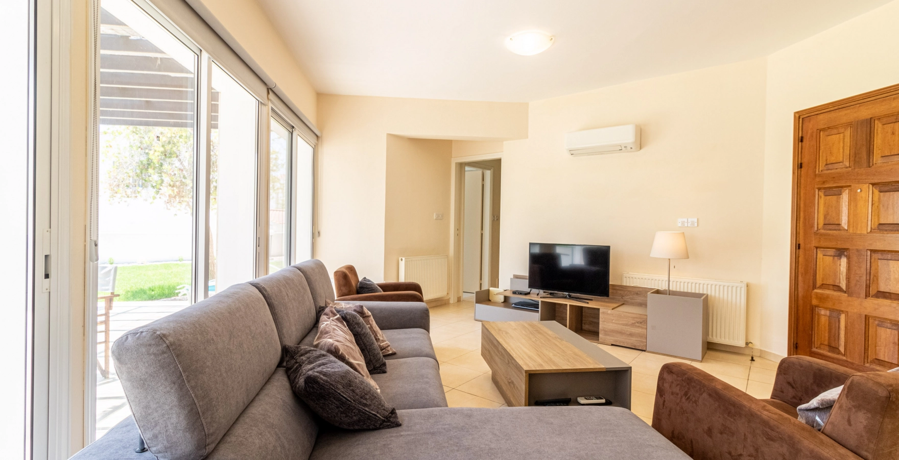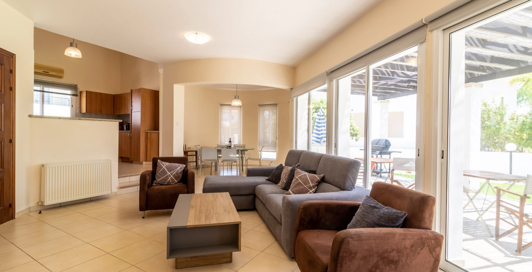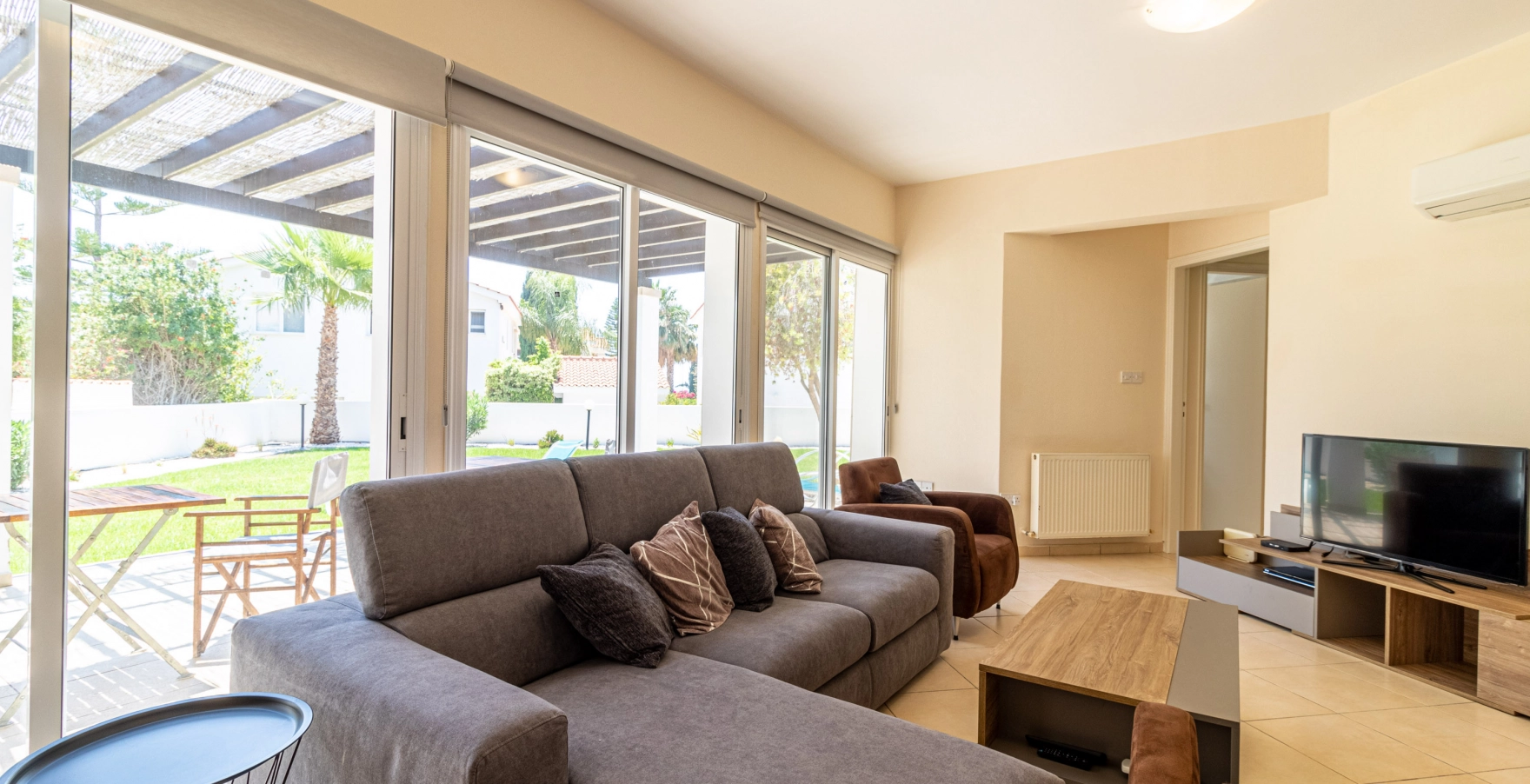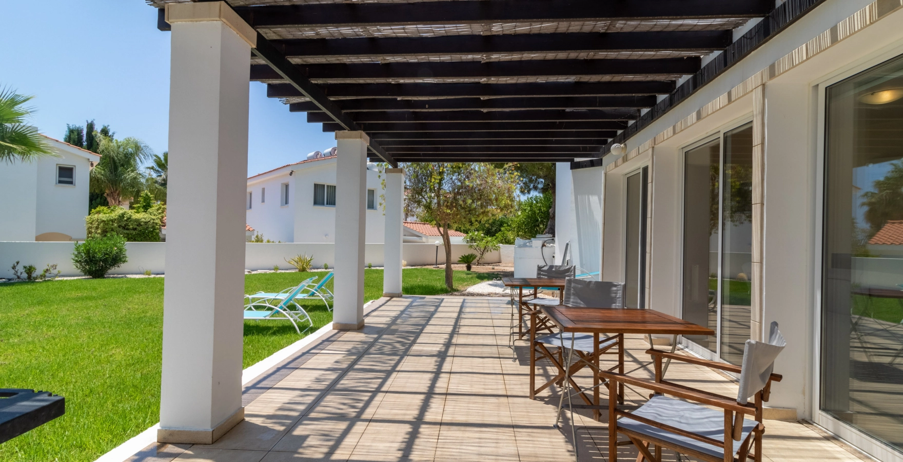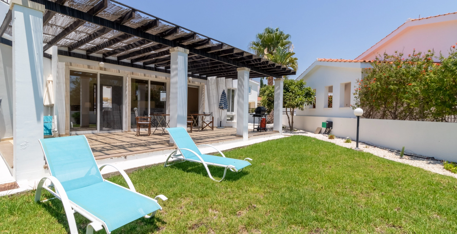 Convenient for families with small children and elderly parents 3 bedroom Villa Yanna. Villa on one floor, three bedrooms, three bathrooms, a hall, a kitchen and a spacious patio turning into a recreation area with a green lawn. A 3-minute walk from the sea and one of the best beaches in Cyprus Coralia beach, where mostly families from different parts of the world relax. The beach is equipped with sun loungers, umbrellas, showers, there is a small cafe on the territory where you can enjoy cool drinks and delicious Cyprus ice cream.